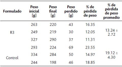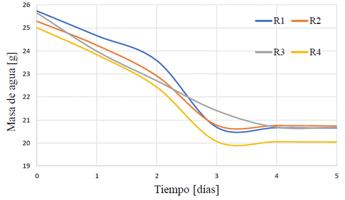 En la Figura 6 se muestra el comportamiento de la pérdida de masa de agua a través del tiempo para las películas evaluadas. De manera general, se puede decir que los recubrimientos se comportaron muy similar entre ellos, y perdieron la totalidad de masa al 4° día de prueba, con una disminución por etapas para las muestras R1, R2 y R4; mientras que la pérdida en la muestra R3 fue gradual, lo que da a entender que el comportamiento de esta formulación es más estable a la pérdida de masa o que tiene un mejor comportamiento a la permeabilidad de vapor de agua.