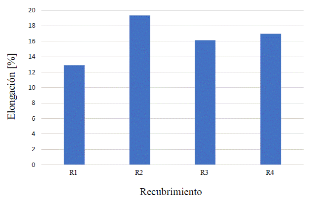 En cuanto a las pruebas mecánicas, en la Figura 8 se presentan los porcentajes de elongación obtenidos para cada uno de los recubrimientos evaluados. Mediante la manipulación de los recubrimientos se pudo evidenciar que estos presentaban características de elasticidad y flexibilidad. Durante la evaluación de los porcentajes de elongación todos los recubrimientos presentaron un comportamiento elástico semejante. No obstante, el recubrimiento R2 presentó una elongación de 19.350 %, la cual corresponde al valor más alto en comparación con los recubrimientos evaluados. Se evidenció que los formulados R2 y R4, que contenían una concentración de 2 % de glicerol, formaron los recubrimientos con mayores porcentajes de elongación; este efecto puede atribuirse a que el glicerol mejora las propiedades de elasticidad y flexibilidad en los recubrimientos, no obstante, el incremento en los valores de elongación implica una mayor deformación del recubrimiento debido a que el glicerol disminuye la atracción molecular entre las cadenas poliméricas, lo que incrementa su flexibilidad; este dato concordó con lo reportado por Chang (Jun, 2000). Los resultados obtenidos con estas formulaciones son similares a los presentados por Romero- Bastida et al. (2011), quienes obtuvieron porcentajes de elongación de 16.88 ± 1.93 % en películas de almidón de plátano.