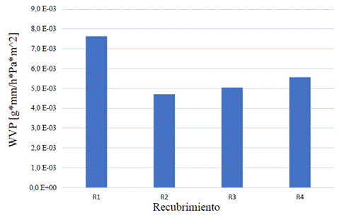Una de las cualidades más importantes en el diseño de recubrimientos es la permeabilidad al vapor de agua, ya que de esto depende que en los frutos se controle la pérdida de agua, y se evite la pérdida de dureza y la ganancia de humedad que puede originar proliferación de microorganismos que afectan la calidad de los frutos. En ese aspecto, el recubrimiento que mejor controló la pérdida de agua fue R2 (4 % almidón y 2 % glicerol), el cual presentó una permeabilidad de 4.7 x 10-3 g*mm/h*Pa*m2 seguido por R3 (3 % almidón y 3 % glicerol) con 5.04 x 10-3 g*mm/h*Pa*m2. La permeabilidad al vapor de agua puede ser afectada por la concentración de glicerol (plastificante), debido a que disminuye la fuerza intermolecular en la matriz polimérica, lo cual otorga una mayor movilidad molecular y aumenta su permeabilidad (Joaqui y Villada, 2013).