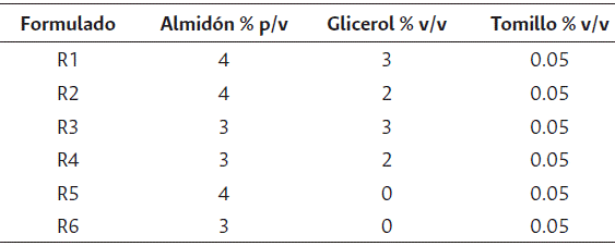 Se desarrollaron 6 recubrimientos variando la concentración de almidón, glicerol y extracto de tomillo. Las concentraciones de cada formulado se presentan en la Tabla 1.