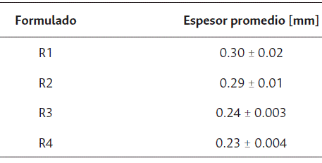En la Tabla 2 se presenta el espesor promedio de los recubrimientos obtenidos; en ella se observa que los tratamientos que contenían una concentración de almidón de 4 % p/v (R1 y R2) obtuvieron un mayor espesor en comparación con los que contenían un 3 % p/v (R3 y R4), lo que indica que la concentración de almidón tuvo un efecto sobre el espesor de los recubrimientos. Los valores de espesor concuerdan con lo reportado por Vázquez-Luna et al. (2018), quienes obtuvieron espesores de 0.04 y 0.05 mm en películas a base de almidón nanoestructurado.