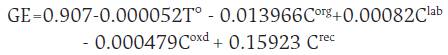 [Ec 1]En la ecuación se observa que los componentes de carbono lábil (Clab) y carbono recalcitrante (Crec) tienen una relación directa con el grado de estabilidad, mientras que en el caso del carbono orgánico (Corg), carbono oxidable (Coxd) y la temperatura se presenta una relación inversa. Asimismo, cabe mencionar que la mayor relación con el grado de estabilidad se presenta en función al carbono recalcitrante (Crec).
