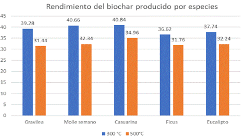 En la Figura 1 se muestra que el rendimiento de la producción de biochar para todas las especies es influenciado por el incremento de la temperatura así a 500 °C de temperatura el rendimiento de la producción del biochar es menor que a 300°C de temperatura.