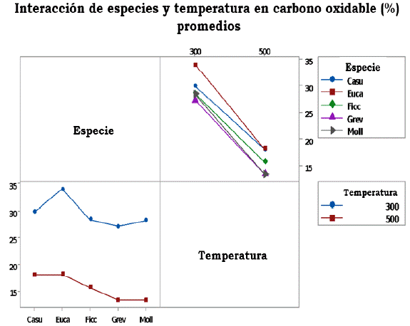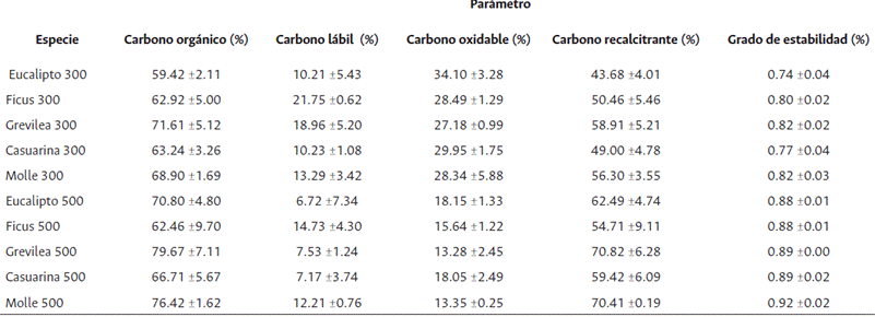 Entre las especies evaluadas, el contenido de carbono lábil en las especies de Grevilea y Molle, presentan un bajo contenido porcentual de 13.25 % y 12.75 %, para 300 °C y 500 °C respectivamente. Asimismo, el contenido de carbono oxidable es bajo entre las especies evaluadas, pues presentan valores de 20.23 % y 20.85 % respectivamente, mientras que el carbono recalcitrante se presenta en mayor proporción, siendo de 64.86 % y 63.36 % respectivamente. Respecto a los valores presentados, se diría que en la especie de Grevilea se presenta una variación de 11.92 % en el carbono recalcitrante respecto a la temperatura, mientras que en la especie de Molle la diferencia es de 14.11 %.