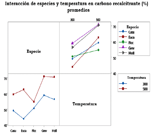 El carbono recalcitrante varía en 4.27 %en función de la temperatura, siendo esta la menor diferencia de las tres fracciones de carbono. La baja diferencia se debería a la composición de la materia prima, puesto que esta se conforma en mayor proporción por hemicelulosa (Pérez-Arévalo y Velazques-Martí, 2018), ya que esta es una estructura carbonosa de fácil descomposición (Heidari et al., 2019); sin embargo, la proporción de este componente varía entre especie, siendo las especies de mayor dureza, como es el caso de Grevilea, las que presentan mayor contenido porcentual de celulosa. El caso contrario se presentaría en el Molle, el cual, al poseer ácidos fácilmente degradables tiende a estabilizarse fácilmente y a aromatizar su estructura más estable (Machado et al., 2019).