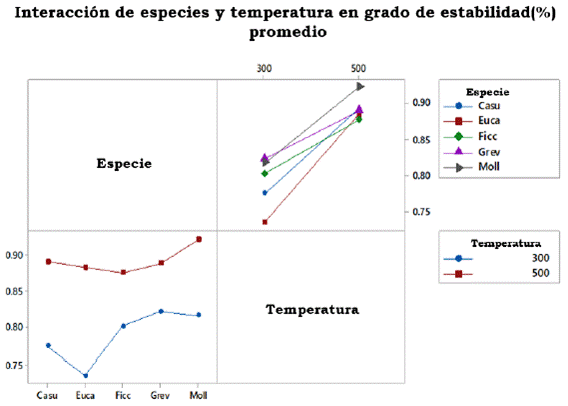 Respecto al grado de estabilidad de las 5 especies presentado en la Figura 4, se presentó un comportamiento que tiene relación con la temperatura, puesto que de manera general el grado de estabilidad es de 0.790 a 300 °C, mientras que a 500 °C este sería de 0.892. Asimismo, al evaluar el grado de estabilidad por especie y temperatura, se observó que este se encuentran entre 0.735 y 0.921; por lo cual, de acuerdo con el indicador de grado de estabilidad que fue fijado en 0.500 por López et al. (2010), los resultados cumplirían con ser una enmienda estabilizada para el suelo.
