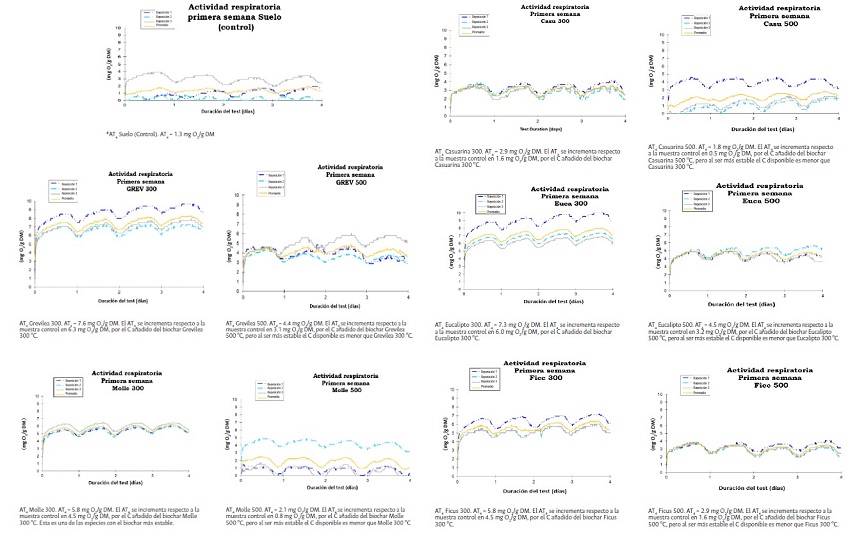 El AT4 se evaluó durante los 7 primeros días de ser añadido el biochar, por lo que la descomposición inicial es rápida, ya que se encuentra disponible el carbono lábil. Este con el tiempo debería de disminuir, puesto que empezará a utilizarse el carbono medio y posteriormente el carbono recalcitrante.