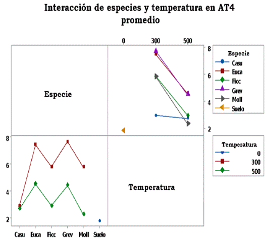 Se observa que la variación de los índices de AT4 conforme se incrementa la temperatura es de 2.74, dado que el promedio de AT4 para biochar de 500 °C es 5.88 y para 300 °C es de 3.14; la diferencia se debería a que, como se describió previamente, a 500 °C el biochar obtenido es una estructura carbonosa más estable, mientras que a 300 °C aun es una estructura de transición, lo que permite una mayor mineralización (Zhang et al., 2019 y Suárez-Abelenda et al., 2017).
