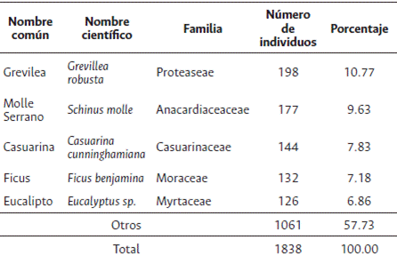 Con base en el inventario de especies forestales de la UNALM, para la presente investigación se recolectaron las 5 especies predominantes en el campus universitario que representan el 42 % del total de individuos. Estas especies son Grevillea robusta, Schinus molle, Casuarina cunninghamiana, Ficus benjamina y Eucalyptus spp. Las especies seleccionadas y el número de individuos identificados en el campus se presentan en la Tabla 1.