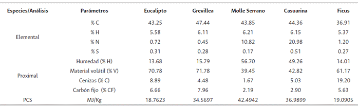 La Tabla 2 muestra los resultados de la caracterización de la materia prima en los análisis elementales, proximal y de poder calorífico superior (PCS). Por su parte, la Tabla 3 muestra el porcentaje de rendimiento obtenido de los biochars de las diferentes especies a 300 °C y 500 °C de temperatura de pirólisis, así como los análisis químicos de pH, conductividad por cada tratamiento y sus respectivas repeticiones.