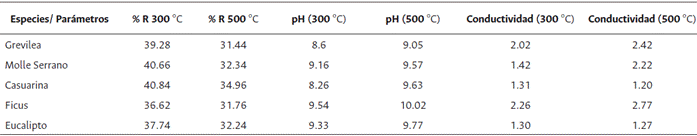 Con respecto a la conductividad eléctrica se observa una ligera variación a 500 °C frente a los valores obtenidos a 300 °C. Así, las especies que presentan ligeros incrementos son: Grevillea, que pasa de 2.02 µS/cm a 2.42 µS/cm; Ficus, de 2.26 µS/cm a 2.77 µS/cm; y Molle Serrano, de 1.42 µS/cm a 2.2 µS/cm. Las especies que presentan ligeras disminuciones son Casuarina, que pasa de 1.31 µS/cm a 1.20 µS/cm, y Eucalipto, de 1.30 µS/cm a 1.27 µS/cm, respectivamente.