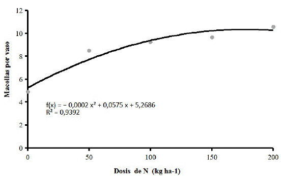 Para Lopes et al. (2013), la altura de las plantas de arroz de secano fue incrementada de forma lineal en un año y cuadrática en el año siguiente, en función de dosis de N hasta 200 kg ha-1 provenientes de diferentes fuentes nitrogenadas. Fonseca et al. (2012), a su vez, observaron incremento lineal en la altura de las plantas de arroz de secano en función de dosis hasta 125 kg N ha-1, apenas en el primer año, sin efecto de las dosis sobre la altura de las plantas para el segundo año de evaluación.