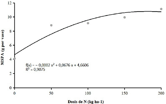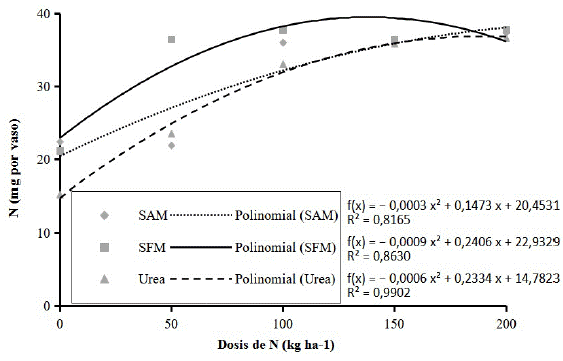 Con relación al contenido de nitrógeno en la parte aérea se visualizó que los resultados presentaron ecuaciones cuadráticas (Figura 4), verificando así que, durante el crecimiento y desarrollo de la investigación, las plantas mostraron respuesta frente a las no tratadas, en que las dosis estimadas que proporcionan mayor absorción de N para SAM, SFM y Urea fueron de 253, 138 y 188 kg de N ha-1.