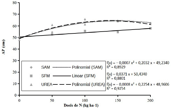 Con relación a la altura de las plantas, Hernandes et al. (2010), Goes et al. (2016) y Ferrari et al. (2017), así como en el presente estudio, observaron que esta se incrementó con el aumento de dosis de N, de forma lineal para los dos primeros y cuadrática para el tercer autor. Mattje et al. (2013) ya observó que la altura de plantas presentó una reducción cuando los niveles de nitrógeno se incrementaron en 120 kg N ha-1.