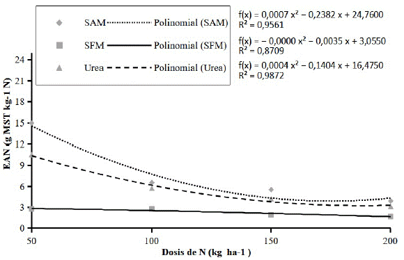 La eficiencia agronómica del nitrógeno (EAN) (Figura 5) presentó una disminución con el aumento de las dosis aplicadas para todas las fuentes de N, siendo que la mejor fuente que tuvo mayores eficiencias de acuerdo con las dosis fue la SAM, lo que demuestra que todo el nitrógeno aplicado no es destinado a la producción de masa seca. Cabe aclarar que las fuentes de N aplicadas experimentan reacciones químicas en el suelo, lo cual puede generar pérdidas principalmente por volatilización.