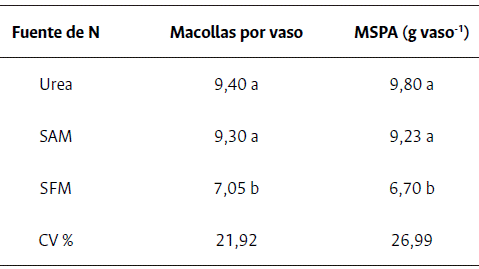 En relación con el poco número de macollas y acumulo de masa seca obtenido con la fuente SFM, esto puede estar relacionado a la baja liberación del nitrógeno en el desarrollo vegetativo inicial de la cultura. Sulfammo es una fuente de lenta liberación, la disponibilidad de N puede haber sido baja en el momento en que la planta más lo necesita para expresar su potencial de macollar, teniendo en cuenta que la mayor parte del nitrógeno absorbido por las plantas del arroz de secano ocurre entre el macollamiento y la floración (Alvarez et al., 2005).