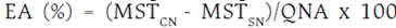 Los cálculos de eficiencia agronómica en las fuentes de nitrógeno fueron empleados por la siguiente ecuación: , donde: EA = eficiencia agronómica de la fuente considerada, MSTCN = masa seca total de las plantas fertilizadas con nitrógeno, MSTSN = masa seca total de las plantas fertilizadas sin nitrógeno, QNA = cantidad de nitrógeno aplicado.