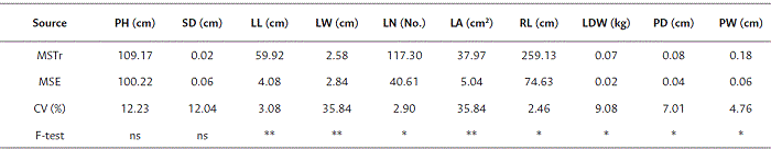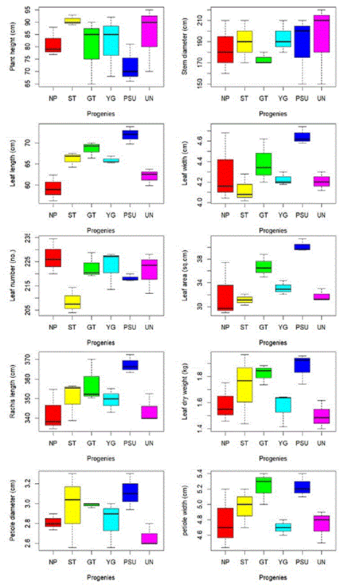 The results of the analysis of variance (ANOVA) of the agronomic traits of hybrid tenera oil palms are illustrated in Table 1 and the boxplot on the agronomic traits of six tenera oil palm progenies is presented in Figure 1. Most agronomic traits (LL, LW, LN, LA, RL, LDW, PD, and PW) were significantly different among the various oil palm progenies at p < 0.05 or 0.01. Only PH and PD were not significantly different among the various oil palm cultivars. The highest coefficient of variation (CV) was obtained from LW (35.84 %) and LA (35.84 %), and the lowest CV was obtained from RL (2.46 %).