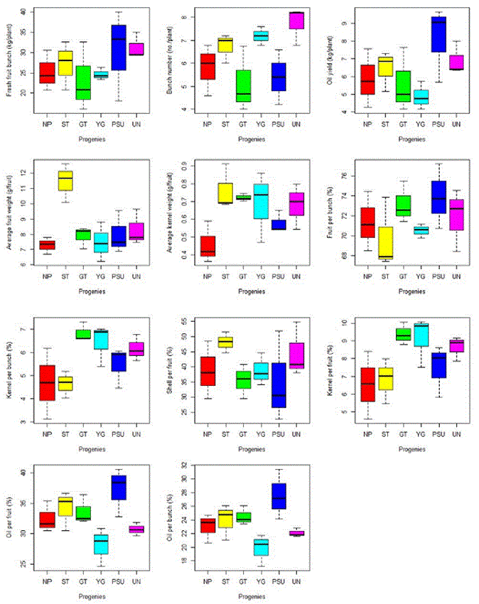 The results of the analysis of variance of the yield traits of hybrid tenera oil palms are illustrated in Table 2 and the boxplot on the yield traits of six tenera oil palm progenies is presented in Figure 2. BN, OY, AFW, AKW, K/F, O/F, O/B, and K/B were significantly different among the oil palm progenies at p < 0.05 or 0.01, while FFB, F/B, and S/F were not significantly different among the oil palm cultivars. The highest CV was obtained from AFW (43.40 %), and the lowest CV was obtained from F/B (3.90 %). The significantly different agronomic and yield traits were calculated as principal component analysis to classify their groups and to find relationships between certain oil palm cultivars and their agronomic, and yield traits.