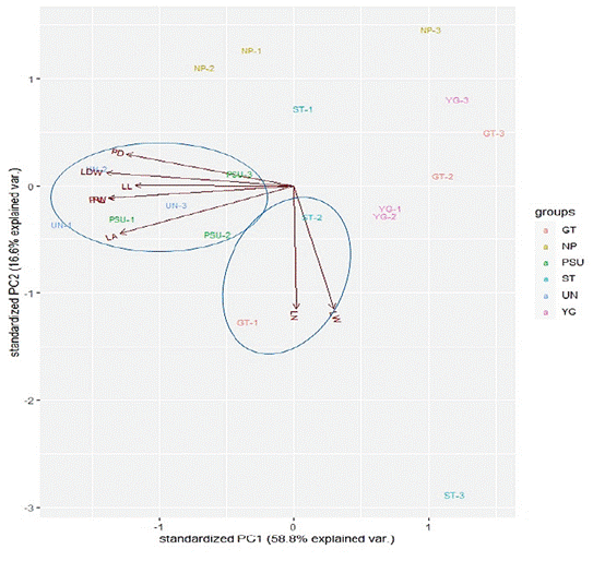 The biplot between PC1 and PC2 of six tenera oil palm progenies and their agronomic traits is shown in Figure 3. This biplot illustrates two groups of oil palm samples according to their respective dominant agronomic traits. The first group (UN-1, UN-2, UN-3, PSU-1, PSU-2, and PSU-3) dominated in PD, LDW, LL, RL, PW, and LA, while the second group (GT-1 and ST-2) dominated in LN and LW.