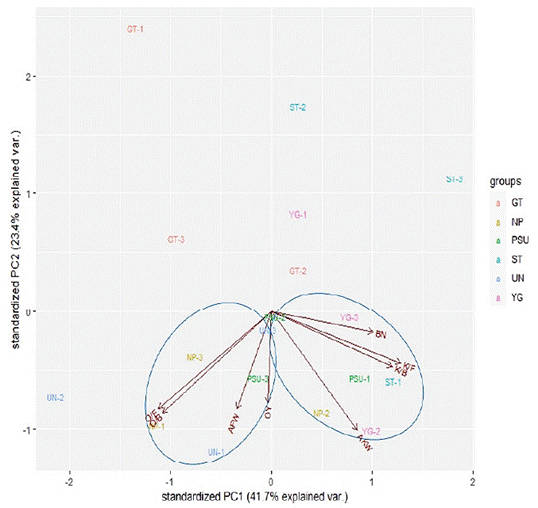 The details of eight components of yield traits are presented in Table 4. The eigenvalues of PC1 to PC3 were 3.34, 1.87, and 1.38, respectively, and their variances were 41.75 %, 23.21 %, and 17.30 %, respectively, representing 82.37 % of the components. The biplot between PC1 and PC2 of six tenera oil palm progenies and their yield traits is shown in Figure 4. This biplot illustrates two groups of oil palm samples according to their respective dominant yield traits. The first group (PSU-1, PSU-2, YG-2, YG-3, NP-2, and ST-1) dominated in BN, K/F, K/B, and AKW, while the second group (PSU-3, UP-1, UP-3, and UN-1) dominated in O/F, O/B, AFW, and OY.