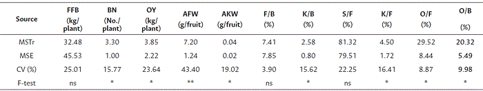 The bunch analysis of oil palm is essential to evaluate its oil yield. Oil palm evaluation in growth and yield parameters is required for several purposes, for example, to select elite and superior tenera oil palms for tissue culture, to select maternal dura palms for high-quality seed production, to select dura and pisifera parental palms for specific hybrid combinations, and to compare oil palm progenies from various parental combinations (Mandal, 2008; Oberthur et al., 2012). For cultivation, several tenera oil palm progenies have been created by private companies and government departments. Each progeny is dominant in various agronomic and yield traits. The progeny which dominates several traits is usually selected for planting in commercial plantations.