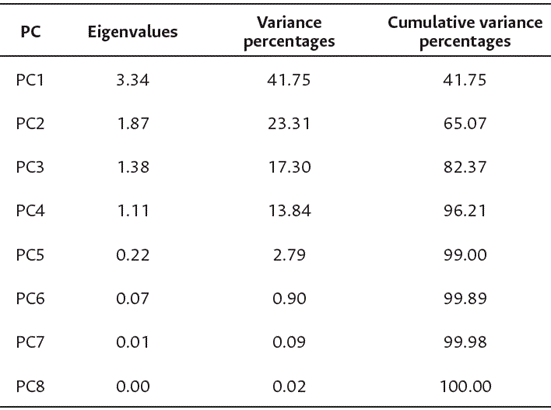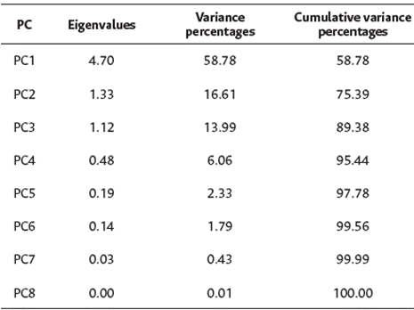 The details of eight components of agronomic traits are presented in Table 3. The eigenvalues of PC1 to PC3 are 4.70, 1.33, and 1.12, respectively, and their variances are 58.78 %, 16.61 %, and 13.99 %, respectively, representing 89.38 % of the components.