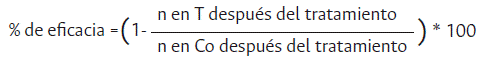 Ecuación 1. Fórmula de Abbott para evaluación de eficacia (%)Donde, n= población de la plaga, T= tratados, Co= control
