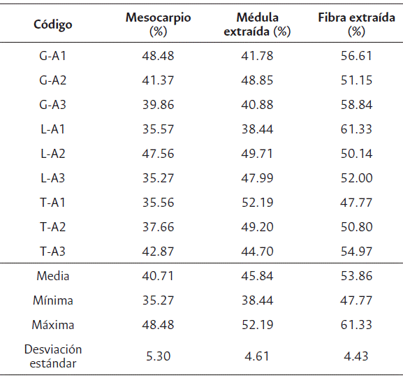 Por otra parte, en cuanto a la cantidad de fibra y médula que se puede extraer del mesocarpio, el contenido de fibra reporta los valores más altos (61.33 % en L-A1) como consecuencia de la característica esponjosa de la médula (Karmegam et al., 2021); no obstante, los estudios no se enfocan directamente en establecer las proporciones de los componentes de la estopa de coco, puesto que se prioriza la productividad para la comercialización y el consumo de productos hacia la industria alimentaria (Granados y López, 2002; Islas y Tzec, 2021; Maruchis et al., 2007), a pesar de que estos subproductos también pueden ser una fuente rentable de ingresos (Islas y Tzec, 2021).