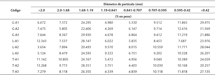 El análisis granulométrico (Tabla 3) indicó que la distribución de partícula en todas las muestras posee una variación similar en todas las fracciones, obteniendo gránulos de médula de coco mayores a 2.0 mm en T-A2, mientras que en G-A2 se alcanzó la mayor cantidad de partículas con un diámetro menor a 0.42 mm; no obstante, Vargas et al. (2008) reportaron un alto porcentaje de partículas mayores a 2.0 mm variando desde un 15.3 % hasta un 39.0 %, al igual que el contenido de partículas finas menores a 0.42 mm es superior, ya que el material particulado menor a 0.50 mm oscila entre un 49.1 % a un 8.5 %; por su parte, Guerrero et al. (2021) obtuvieron una distribución de partícula donde en el tamiz de 2.0 mm se retuvo un 13.69 % del material, semejante a T-A2, y el gránulo más fino menor a 0.50 mm tuvo una proporción de 35.8 %.