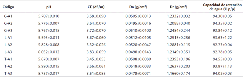 La capacidad de retención de agua en todas las muestras se mantuvo sobre un margen similar (Tabla 4), oscilando entre 92.73 ± 0.04 a 94.55 ± 0.03 % p/p, ya que como lo menciona Guerrero et al. (2021), la médula de coco posee un alto número de poros entre sus partículas que, además de permitir almacenar humedad, facilita el proceso de drenaje; no obstante, durante el cultivo, el flujo constante de agua puede generar un cierto grado de compactación a causa del tamaño de la partícula, provocando una mayor retención de agua (Ansorena, 1994; Vargas et al., 2008); por tanto, es recomendable tener un tamaño de partícula variable que aumente la aireación del sustrato y, a su vez, disminuya la retención de humedad (Noguera et al., 2003).