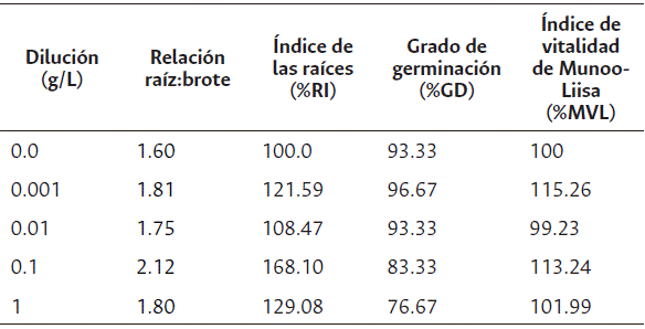 La Tabla 5 permitió determinar que existe diferencia significativa entre los tratamientos, no obstante, no se aprecia efectos de fitotoxicidad de la médula cruda de coco sobre la germinación de semillas de berro (Lepidium sativum), puesto que el índice de vitalidad de Munoo-Liisa (MVL) en los tratamientos son superiores al control, a excepción del 99.23 % de la dilución 0.01 g/L; con un grado de germinación que es proporcionalmente inverso a la concentración de la dilución de médula, donde la dilución 1.0 g/L muestra una leve inhibición, Cesaro et al. (2015) expresan que un índice de germinación menor al 80 % empieza a mostrar señales inhibitorias sobre el crecimiento de las plantas, pero no debe ser menor al 50 % para considerarse fitotóxico (Gavilanes et al. 2016; Vargas et al., 2008).