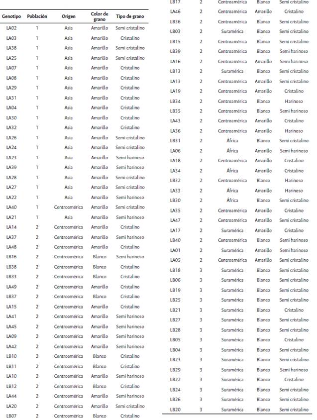 En el ensayo se incluyeron 30 líneas élite del programa de mejoramiento de Semillas Valle S.A. como parentales, incluyendo líneas de grano color blanco y amarillo. Se realizaron cruzamientos entre los 30 parentales, sin incluir los recíprocos, de acuerdo con el método II descrito por Griffing (1956), para un total de 435 cruzamientos [ (P(P-1))/2] y los 30 parentales. La obtención de semilla se realizó en el Centro Experimental de Semillas Valle S.A. ubicado en el municipio de El Cerrito, Valle del Cauca, Colombia.