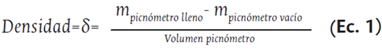 Por último, se pesó el picnómetro lleno con el tapón esmerilado. El proceso se realizó por triplicado a una temperatura de 25 °C y la determinación de la densidad se realizó con la ecuación 1.