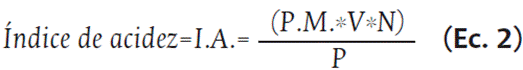 2. Índice de acidez: de acuerdo con la metodología de la NTC 218, se pesaron en un matraz aproximadamente 7 gr del aceite extraído. Posteriormente, en un Erlenmeyer se calentaron 50 ml de etanol con 0.5 ml del indicador de fenolftaleína hasta alcanzar una temperatura de 70 °C, para luego neutralizar el etanol con una solución de KOH 0.1 N. Luego de esto se agregó el etanol neutralizado a la porción de ensayo en el primer matraz y se mezcló. Se llevó el contenido a ebullición y se tituló con la solución de KOH, agitando el contenido del matraz vigorosamente durante la titulación. Se realizó el procedimiento para las muestras en estudio expresando el resultado en mg de KOH/ 100 g por triplicado, y calculando el valor con la ecuación 2.