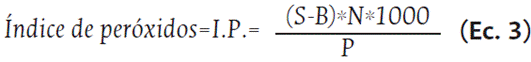 3. Índice de peróxido: el procedimiento se basó en la norma NTC 236. Se calentó el aceite en una plancha de calentamiento a 60 °C hasta lograr homogenización. Por otro lado, se pesó aproximadamente 5 gr de aceite en un Erlenmeyer de 250 ml. Después se disolvió completamente la muestra adicionando 50 ml de una solución ácido acético : cloroformo 3:2 V/V. Seguido a esto, se adicionaron 0.5 ml de KI saturado agitando por espacio de 1 minuto y se detuvo la reacción adicionando 30 ml de agua destilada. Luego se adicionó 1 ml de la solución indicadora de almidón. Se tituló con tiosulfato de sodio (Na2S2O3) 0.01 N hasta que el color negro de la muestra desapareció y dio lugar al amarillo inicial. Este mismo procedimiento se realizó con un blanco. Esta medición se realizó por triplicado y su resultado se expresa en mmol O2/kg muestra a partir de la ecuación 3.