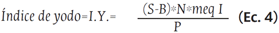 4. Índice de yodo: siguiendo los parámetros señalados por la AOAC 920.159, a un balón de 500 ml se adicionaron 20 ml de tetracloruro de carbono (CCl4). Posteriormente, se adicionaron 25 ml del reactivo de Wijs. Luego se tapó el matraz y se mantuvo en un sitio oscuro por 1 hora. Terminado el tiempo de reacción, se adicionaron 20 ml de yoduro de potasio (KI) y 100 ml de agua. Finalmente, se tituló con una solución normalizada de tiosulfato de sodio 0.1 N hasta obtener una coloración amarilla, que indica la desaparición del yoduro producido. Se adicionaron unas gotas de la solución de almidón al 15 % P/V y se continuó la titulación hasta la desaparición del color azul después de una agitación vigorosa. El procedimiento se repitió por triplicado y el resultado se expresó en gramos de yodo/100 g de muestra mediante la ecuación 4.