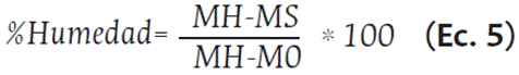 5. Porcentaje de humedad: Basados en la norma NTC 287. Se pesó el aceite en un vaso precipitado y se secó en un horno de secado universal marca Memmert hasta alcanzar una masa constante. Finalmente se dejó enfriar el frasco y se pesó. La determinación se realizó por diferencia de pesos mediante la ecuación 5.