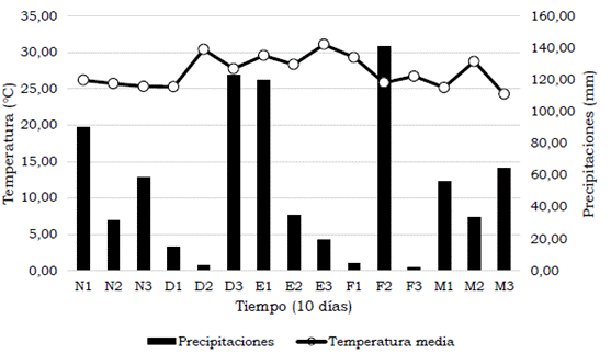 El clima de la región se caracteriza por presentar una temperatura promedio de 24 ºC, con máximas que pueden llegar hasta los 45 ºC en verano, y mínima de hasta 6 ºC en invierno, con leve incidencia de heladas. La precipitación media anual es de 1300 mm. Los datos promedio, considerando la precipitación y temperatura decenales durante el transcurso del experimento se muestran en la Figura 1 (DMH, 2018).