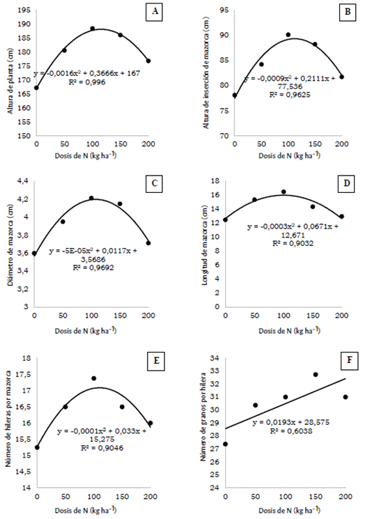Además, los resultados de la longitud de mazorca fueron similares a los encontrados por Marini et al. (2015), quienes verificaron efectos distintos y una respuesta cuadrática con la aplicación de diferentes dosis de nitrógeno. Sin embargo, los resultados difieren de los demostrados por Dotto et al. (2010), quienes encontraron que no hubo respuesta positiva a la aplicación de nitrógeno en la longitud de mazorca.