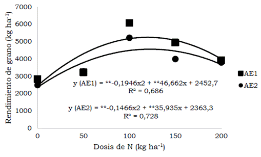 Los datos obtenidos en la variable de rendimiento de maíz (Figura 3) indican la interacción significativa al 5 % entre arreglo espacial y dosis de nitrógeno evaluado en siembra directa, por lo que se prosiguió a ajustar un modelo de regresión polinómica para la aplicación de fertilizante nitrogenado (0; 50; 100 y 150 kg ha-1). En cuanto al distanciamiento de 0.20 m de planta y 1 una planta por punto de siembra (AE1), se alcanza un rendimiento máximo de 5249.9 kg ha-1 con una dosis de nitrógeno correspondiente a 119.89 kg ha-1. Con respecto al distanciamiento de 0.40 m y 2 plantas por punto de siembra (AE2), se registra un rendimiento máximo de 4565.42 kg ha-1 con una dosis de nitrógeno de 122.56 kg ha-1.