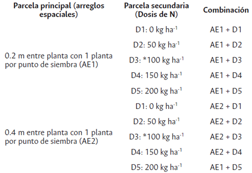El diseño experimental utilizado fue en Bloques Completos al Azar (DBCA) con parcelas subdividas, dispuestos en esquema factorial (2x5), con cuatro repeticiones, correspondiendo la parcela principal a 2 arreglos espaciales (0.2 m entre plantas con 1 planta por punto de siembra y 0.4 m entre plantas con 2 plantas por punto de siembra); y la parcela secundaria, a 5 dosis de fertilizante nitrogenado (0,50, 100, 150 y 200 kg ha-1); en la Tabla 1 se observa la descripción de los tratamientos. Cada parcela tuvo una dimensión de 17.5 m2, siendo 5 m largo y 3.5 m ancho. Como área útil fueron consideradas 4.0 m de largo y 2.1 m de ancho.