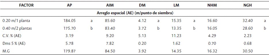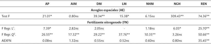 Se encontraron efectos principales significativos para arreglos espaciales en las diferentes variables evaluadas, excepto altura de inserción de mazorca y número de hileras por mazorca. Para el fertilizante nitrogenado hubo significancia en el análisis de regresión. La interacción solo resultó significativa al 1 % para el rendimiento (Tabla 2).