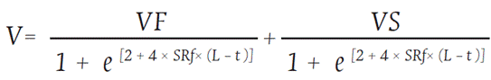 Where V is the accumulated gas production at time (t), Vf is the final gas volume of fast production (fast volume, mL gas/g DM incubated), Vs is the final gas volume of slow production (slow volume, mL gas/g DM incubated), SRf and SRs are the specific gas production rates (h-1), and L is the lag time (h) (Smith et al., 2019).
