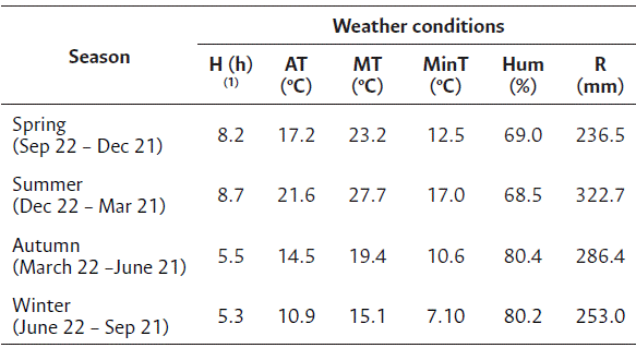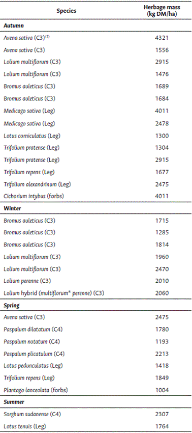 Sampling was conducted from November 2004 to May 2005 on 30 commercial farms. Mean weather conditions of the sampling period (divided by seasons) are shown in Table 1. The soils of the farms corresponded to typic argiudolls (Soil Survey Staff, 2022) with clay loam texture and 2 to 5 % slopes. One plot per farm (established as pure stand) was selected for the experiment. The plots had different herbage mass (from 1000 to 4300 kg DM/ha, Table 2), but all were at vegetative stage, under grazing management, and corresponded to 18 species of 4 botanical groups: C3 grasses (n = 14), C4 grasses (n = 4), legumes (n = 10), and forbs (n = 2). Each plot was sampled the day before entering the animals to graze; the herbage mass was measured by cutting 20 quadrats of each forage (0.1 m2) to soil level with shears and sampled at three different times of the same day (09:00, 13:00, and 17:00 h), each time on 5 random places of the plot at 5 cm of the ground using manual shears. As the main objective was to study the changes in in vitro gas production of the forages throughout the day, the ‘treatment’ was the time of cut (09:00, 13:00, or 17:00 h), and the plots were used as replicates.