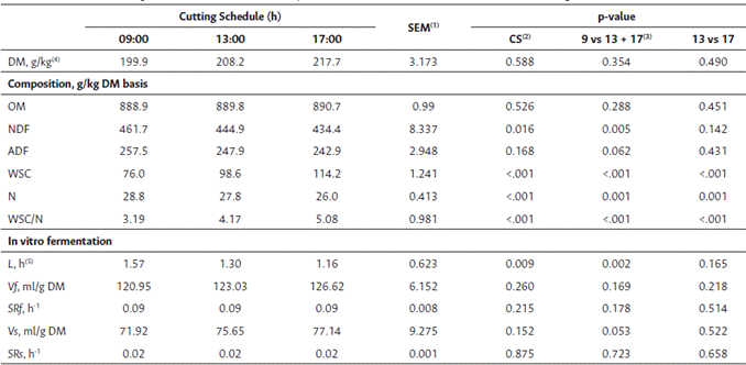 No significant interactions between botanical groups (BG) and cutting schedule (CS) were detected for any chemical composition variables evaluated (Table 3). The WSC concentration and WSC/N ratio were lower when plants were cut in the morning (09:00 h).