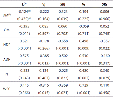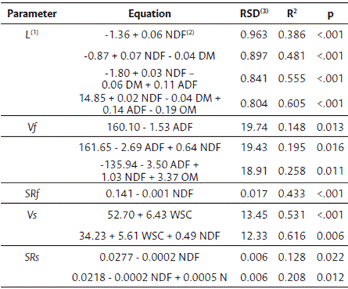 Table 5 shows the best equations predicting gas production according to the chemical composition of the forages. The coefficients of determination were higher than 60 % for L and Vs. For Vf and SRs, they were lower than 30 %. NDF or ADF were included in all equations with the highest relative weights, except for Vs, where WSC was the best single predictor.
