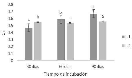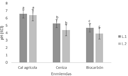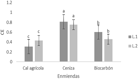 Los resultados de ANOVA para la CE mostraron diferencias significativas en la respuesta a las enmiendas (cal, ceniza y biocarbón) (Tabla 3). Estos resultados confirman que las enmiendas y su interacción con los tiempos de incubación (E x T) fueron determinantes en el incremento de la CE; en ellos, la ceniza mostró un impacto particularmente alto en el aumento de la CE comparado con otras enmiendas (Figura 3). Esta observación es crucial para nuestro objetivo de identificar enmiendas que efectivamente modifiquen la conductividad eléctrica del suelo y faciliten la selección de estrategias de manejo adecuadas para mejorar la fertilidad del suelo. La CE se incrementó ligeramente en L1 (de 0.47 a 0.67 d Sm-1), no así en L2, donde los valores se mantuvieron sin variaciones. (Figura 4).