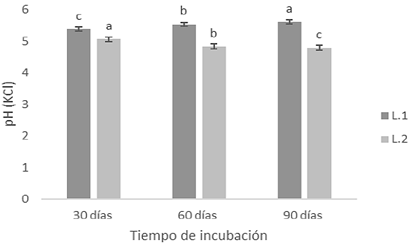 La prueba ANOVA para el efecto de las enmiendas (cal, ceniza y biocarbón) en las 2 localidades mostraron diferencias significativas a los 30, 60 y 90 días (Tabla 1). Esto indica que los 3 tipos de enmiendas, los periodos de incubación y su interacción (E x T) influyeron significativamente en el incremento del pH en KCl. La cal agrícola demostró un efecto superior en mejorar las condiciones de pH (L1 = 6.58 y L2 = 6.41) comparado con la ceniza (L1 = 5.26 y L2 = 4.38) y el biocarbón (L1 = 4.69 y L2 = 3.92), lo cual se alineó con el objetivo de evaluar la eficacia de diferentes enmiendas en la modificación del pH del suelo (Figura 1). La variación en los tiempos de respuesta entre las localidades (90 días en L1 = 5.61 y 30 días en L2 = 5.06) se muestra en Figura 2, en la que se observa un comportamiento distinto entre las 2 localidades, lo que puede estar sujeto a distintas condiciones edafoclimáticas y al manejo agrícola, subrayando la importancia de considerar las condiciones locales en la gestión del pH del suelo.
