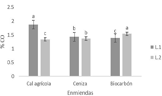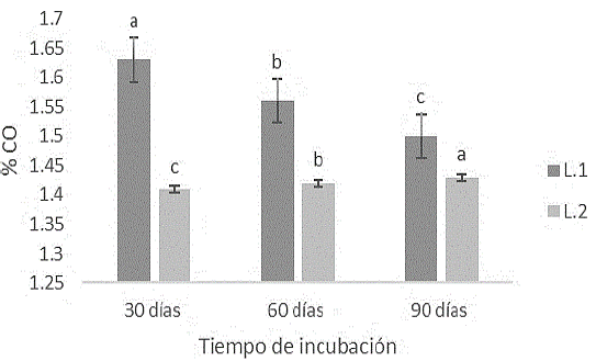 La variabilidad en el contenido de carbono orgánico en respuesta a las diferentes enmiendas y dosis fue estadísticamente significativa en ambas localidades (Tabla 4). Este hallazgo es relevante para el objetivo de explorar cómo distintas enmiendas afectan la materia orgánica del suelo, un factor crucial para la sostenibilidad del suelo y la productividad agrícola. La cal agrícola presentó el mayor valor de % CO (1.87 %), diferente a lo obtenido cuando se utilizó ceniza (1.43 %) y biocarbón (1.39 %) en L1; sin embargo, en L2 el uso de biocarbón (1.54 %) mostró el mayor valor (1.54 %), diferente a cal agrícola (1.34 %) y ceniza (1.37 %) (Figura 5). En cuanto al tiempo de incubación, el comportamiento del % CO mostró una ligera disminución a medida que transcurrió el tiempo de incubación en L1; sin embargo, en L2 los valores se mantuvieron sin variación.